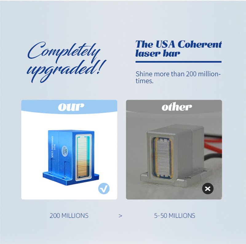 Power up to 2000W, 1600W, 1200W or 800W optional to meet your business needs. American coherent laser can reach 200 million pulses, reducing treatment time and improving customer satisfaction.
