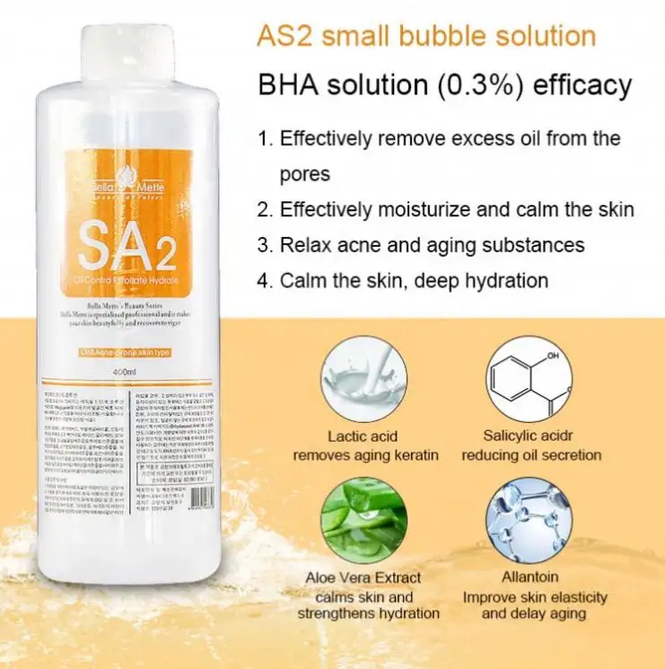 SA2 Aqua Peel Solution contains salicylic-acid-based exfoliating elements, ideal for deeper pore care.