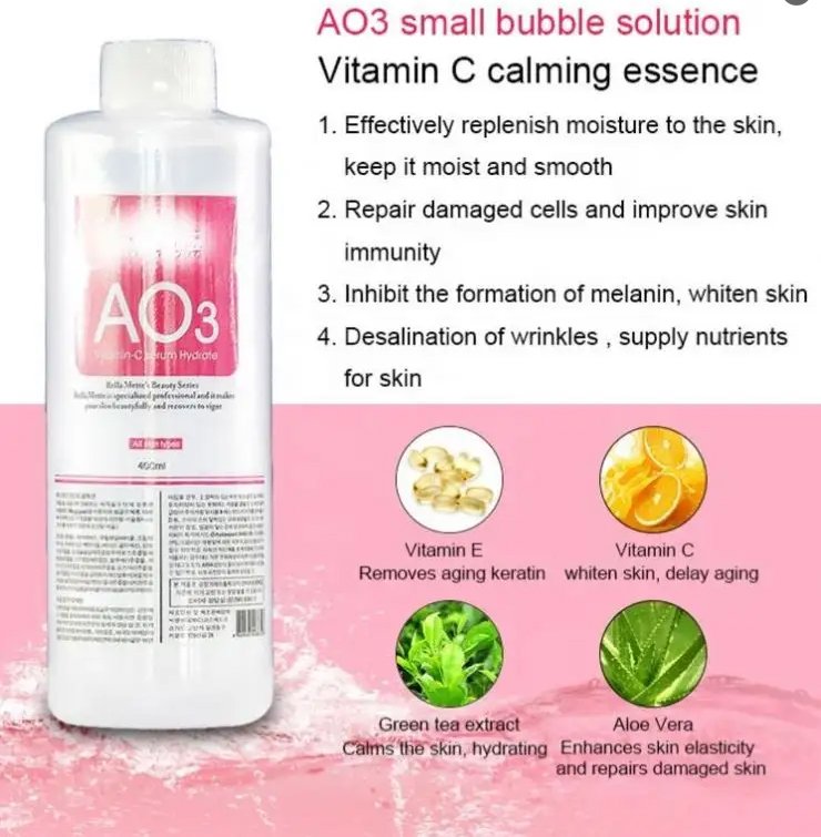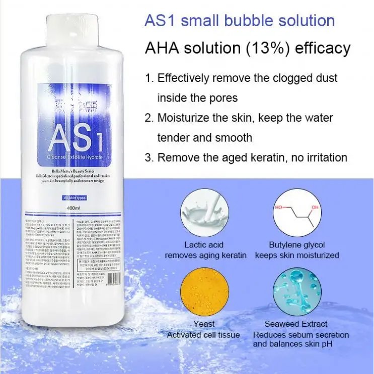 Small Bubble Solution (AS1 SA2 AO3) is a professional hydra dermabrasion facial solution used with aqua peel machines to deeply cleanse pores, remove blackheads, exfoliate dead skin cells, and hydrate the skin through oxygen bubble infusion.