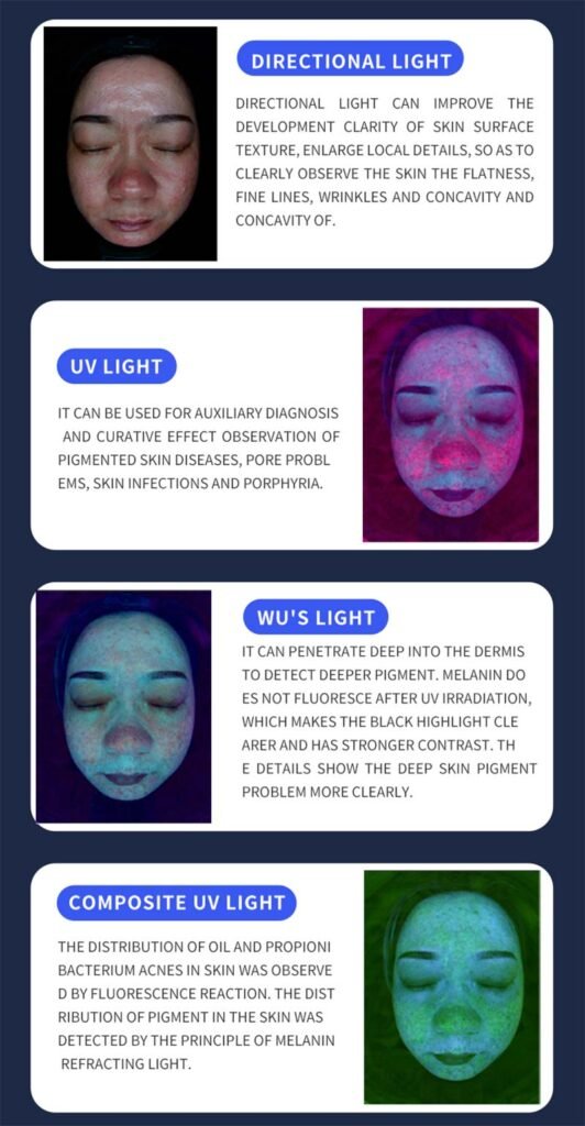 UV light – Reveals hidden sun damage, bacterial buildup, and clogged pores